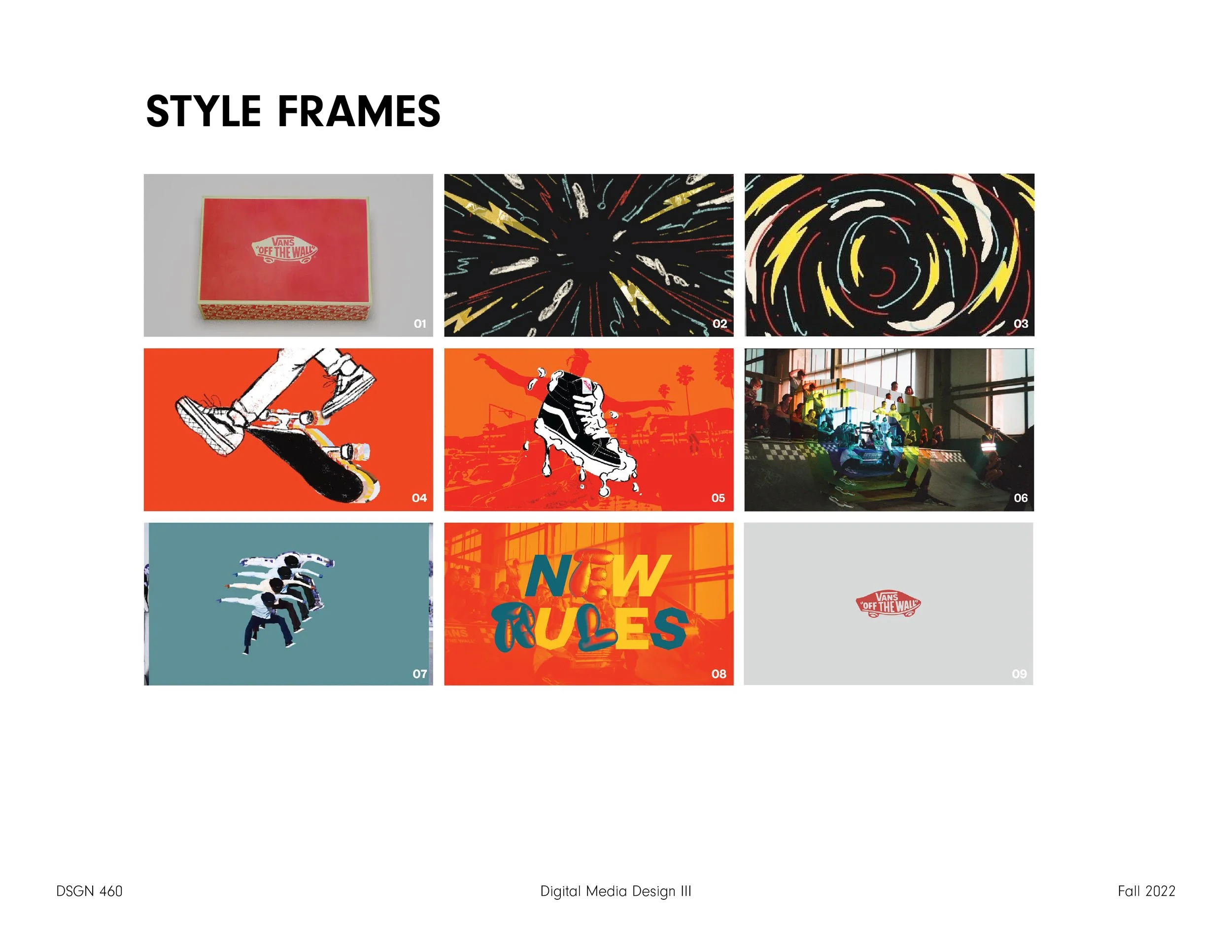 Promo for “Vans”, created by Luke Shelley, Daniel Geiszler, and Charlotte Offin in my DSGN 460 class. A mixed-media approach integrating cel animation, footage, 3D, and typography.